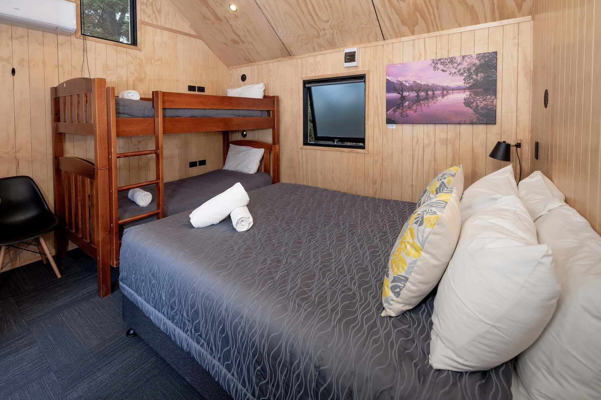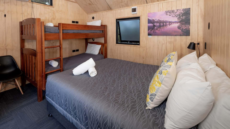 A great value accommodation option! These cosy cabins offer a rustic vibe reminiscent of a ‘Goldminer’s Cottage’. There is a queen bed and a set of bunks – somewhere cosy to sleep for those who just need a roof over their head. With a heat pump and electric blankets, there’s no risk of getting too cold. Guests will need to use the shared kitchen, toilets, and free hot showers. You will also need to supply your own cooking & eating equipment, or hire it from reception for $5 per day. All bedding is provided. Towels are available for hire at an additional cost, which can be arranged on arrival.